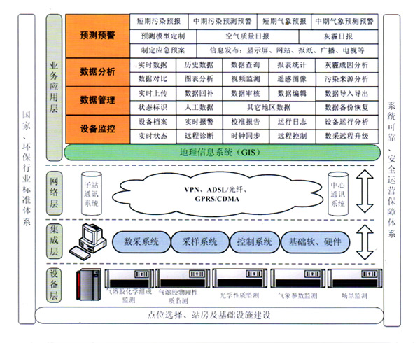 大氣復(fù)合污染物監(jiān)測體系主要由設(shè)備層、集成層、網(wǎng)絡(luò)層及業(yè)務(wù)應(yīng)用層組成。