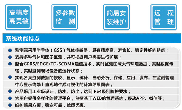 工業(yè)園區(qū)環(huán)境空氣質(zhì)量監(jiān)測系統(tǒng)由前端監(jiān)測設備(可監(jiān)測如:粉塵顆粒物、一氧化碳(CO)、二氧化碳(CO2)、二氧化硫(SO2)、二氧化氮(NO2)、一氧化氮(NO)、臭氧(O3)、甲烷、硫化氫、噪音、溫濕度等等)、數(shù)據(jù)傳輸網(wǎng)絡、管理平臺三部分組成。可對普通辦公、電子、機械、化工等工業(yè)企業(yè)園區(qū)實施全方位監(jiān)測監(jiān)控。