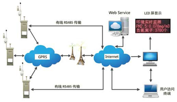 本系統以互聯網為紐帶,與云技術相結合,組建現場端到監控平臺的一個城域網,實現各監控點與監控平臺的連接?,F場端設備按照國家相關技術協議將實時粉塵監測濃度、噪聲指標、氣象六參數(風速風向、溫濕度、大氣壓、降水量)數據及環境圖像信號傳輸到監控平臺,監控平臺對監控數據和圖像進行存儲、統計、分析、處理,為重點區域環境管理提供數據支持和決策依據。(見原理圖)