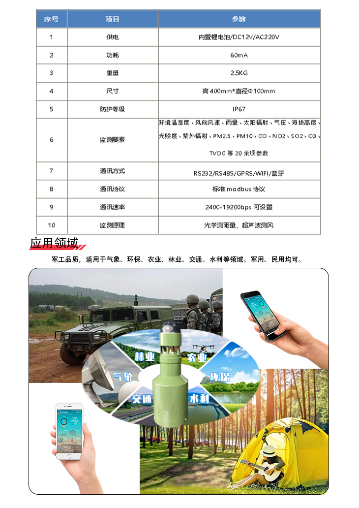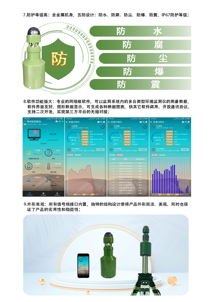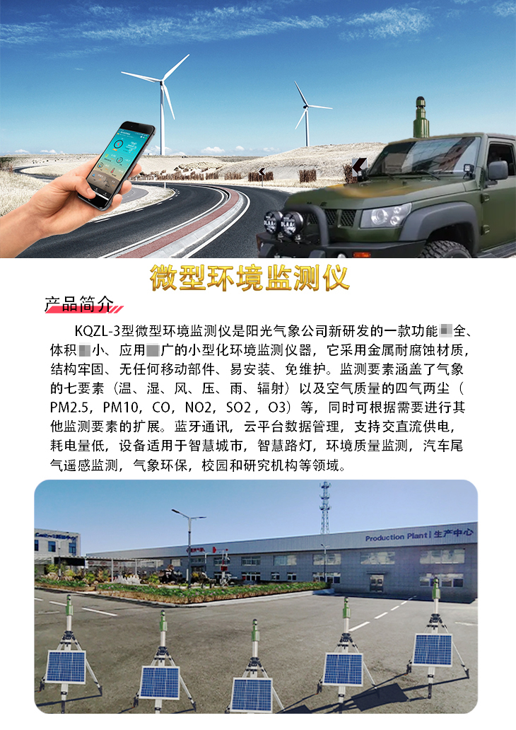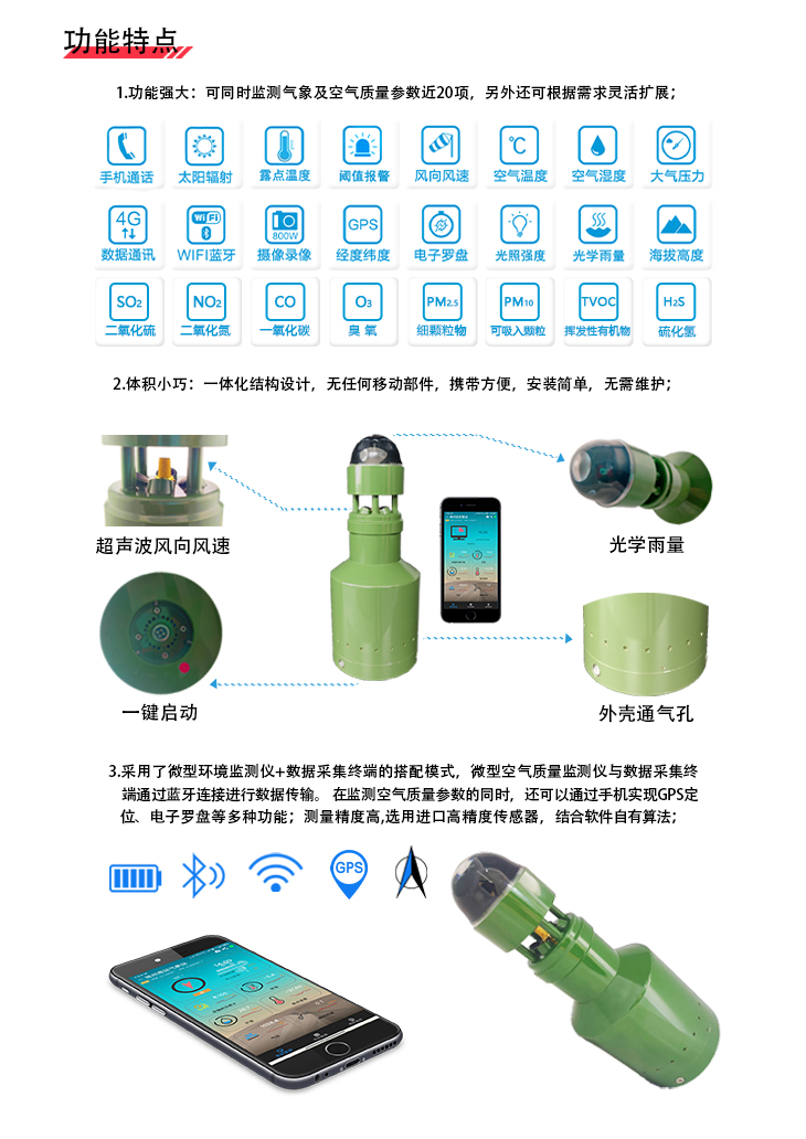 KQZL-3型微型環(huán)境監(jiān)測儀是陽光氣象公司新研發(fā)的一款功能全、體積小、應用廣的小型化環(huán)境監(jiān)測儀器,它采用金屬耐腐蝕材質,結構牢固、無任何移動部件、易安裝、免維護。監(jiān)測要素涵蓋了氣象的七要素(溫、濕、風、壓、雨、輻射)以及空氣質量的四氣兩塵(PM2.5,PM10,CO,NO2,SO2 ,O3)等,同時可根據需要進行其他監(jiān)測要素的擴展。藍牙通訊,云平臺數據管理,支持交直流供電,耗電量低,設備適用于智慧城市,智慧路燈,環(huán)境質量監(jiān)測,汽車尾氣遙感監(jiān)測,氣象環(huán)保,校園和研究機構等領域。
