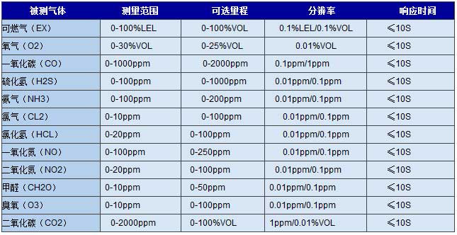 常規氣體種類及參數 (未列出的氣體種類、量程、分辨率可來電訂制)
