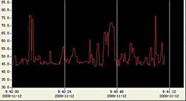 智能噪聲儀,采用數字化聲學分析測試儀為基礎進行連續測量(一般持續測量24小時),每間隔1.0s自動采樣記錄,并使用計算機讀取數據,繪制噪聲曲線(dB-h)。為了解城市輕軌鐵路噪聲對某小區影響的情況,,于2009年11月12日對某小區輕軌噪聲進行了12小時連續監測,測點距輕軌直線距離70米。監測統計結果如下