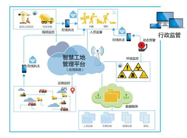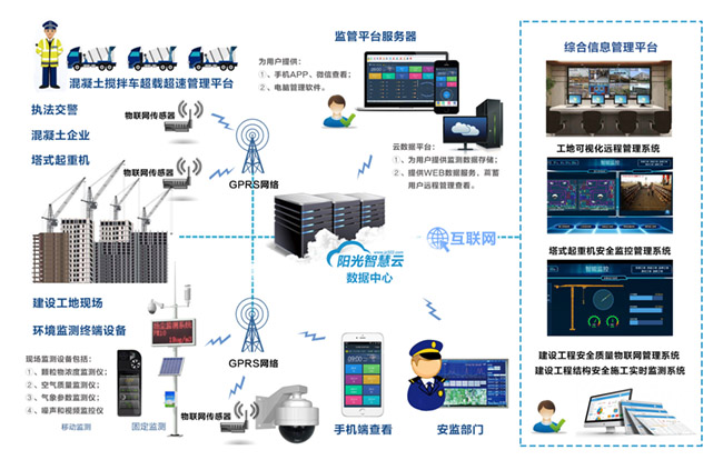 系統(tǒng)建設(shè)采用先進(jìn)的物聯(lián)網(wǎng)技術(shù),主要由信息采集層、網(wǎng)絡(luò)接入層、網(wǎng)絡(luò)傳輸層、信息存儲(chǔ)與處理層組成。將移動(dòng)執(zhí)法終端、施工升降機(jī)、塔式起重機(jī)作業(yè)產(chǎn)生的動(dòng)態(tài)情況、工地周圍的視頻數(shù)據(jù)、混凝土攪拌車超載超速信息及時(shí)上傳給綜合管理平臺(tái)。系統(tǒng)同時(shí)結(jié)合工地可視化遠(yuǎn)程管理系統(tǒng)、塔式起重機(jī)安全監(jiān)控管理系統(tǒng)、建設(shè)工程結(jié)構(gòu)安全實(shí)時(shí)監(jiān)測(cè)系統(tǒng)等系統(tǒng)對(duì)工地監(jiān)測(cè)信息的采集,實(shí)現(xiàn)工地的實(shí)時(shí)監(jiān)督管理,最終有效提升政府部門科學(xué)管理水平。