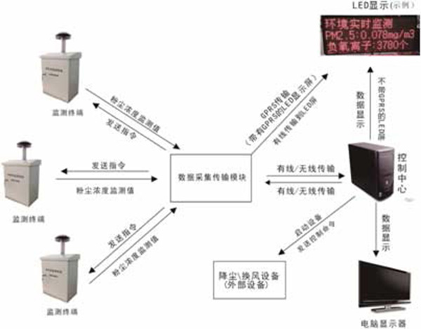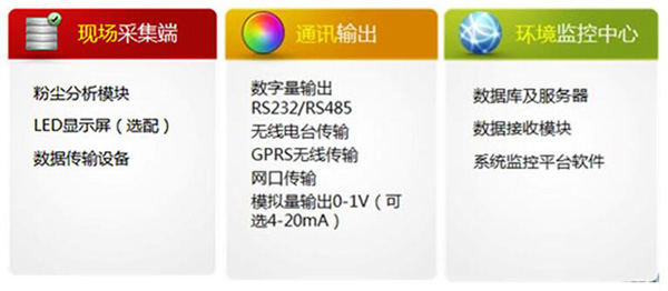 本系統以有線232傳輸方式為紐帶,組建現場端到監控平臺的一個城域網,實現各監控點與監控平臺的連接。現場端設備按照國家相關技術協議將實時粉塵監測濃度指數傳輸到監控平臺,監控平臺對監控數據進行存儲、統計、分析、處理,為重點區域環境管理提供數據支持和決策依據。