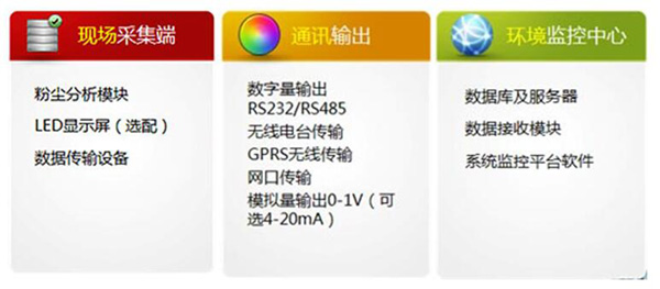 本系統以有線232傳輸方式為紐帶,組建現場端到監控平臺的一個城域網,實現各監控點與監控平臺的連接。現場端設備按照國家相關技術協議將實時粉塵監測濃度指數傳輸到監控平臺,監控平臺對監控數據進行存儲、統計、分析、處理,為重點區域環境管理提供數據支持和決策依據。