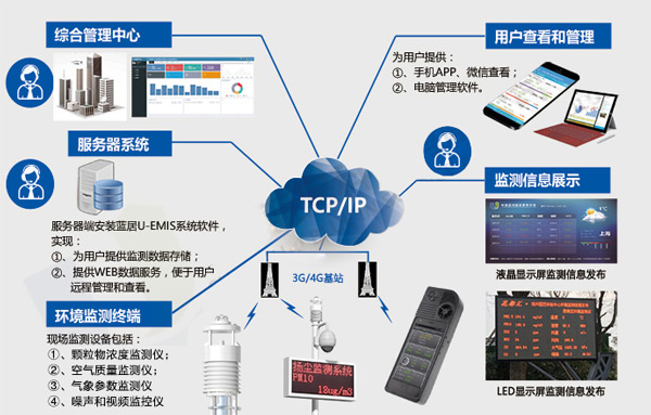 本系統由顆粒物監測系統、噪聲監測系統、氣象監測系統、視頻監控系統、無線傳輸系統、供電系統和后臺數據處理系統及云信息監控管理平臺組成。監測子站集成了大氣PM2.5、PM10監測、環境溫濕度及風速風向監測、噪聲監測、視頻監控及污染物超標視頻抓拍(選配)、有毒有害氣體監測(選配)等多種功能;數據平臺是一個互聯網架構的網絡化平臺,具有對各子站的監控功能以及對數據的報警處理、記錄、查詢、統計、報表輸出等多種功能。