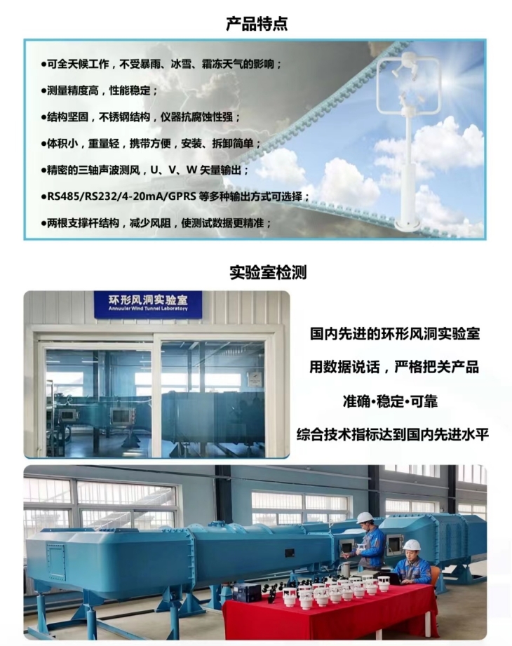 EC-A6型三維超聲波風速風向傳感器采用先進的超聲波測量技術,獨特的兩根支撐桿結構設計,大大減小了風阻的影響,提升了測量的精度。它具有全金屬材質,沒有任何移動部件,堅固耐用的特點,可以同時測量水平和垂直方向的風向, X/Y/Z軸風速(即U、V、W矢量輸出),聲溫、聲速等參數。適應在各種環境下,全天候、長久的正常工作,為各領域的氣象監測提供可靠數據。三維超聲波風向風速傳感器用來測量近地風向、風速。廣泛應用于城市環境監測、風力發電、氣象監測、橋梁隧道、航海船舶、航空機場等領域。