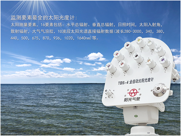 監測10波段太陽直接輻射,太陽總輻射、散射輻射、日照時數、太陽高度角、經度、緯度、海拔高度、大氣氣溶膠厚度、9波段天空光等