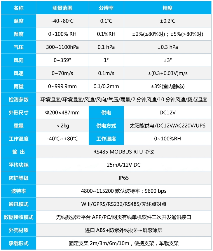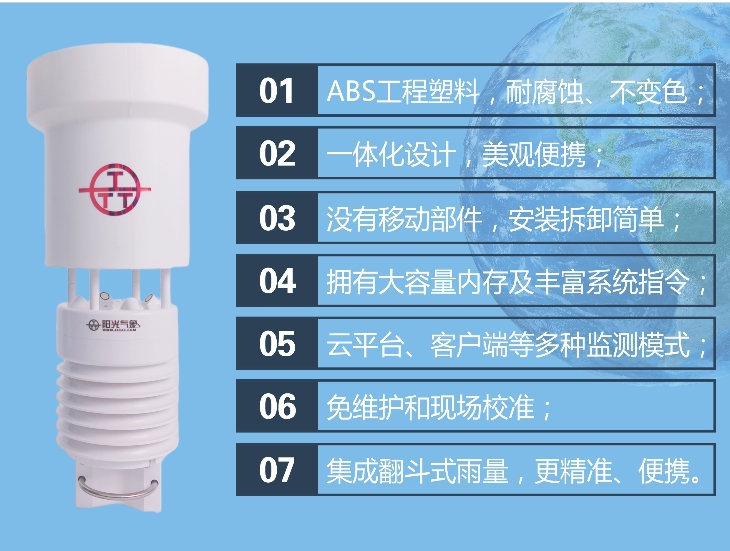 PC-8K氣象六參數(shù)環(huán)境監(jiān)測儀是我公司自主研制的一款測量多種氣象要素的一體化氣象站,可同時測量大氣溫度、大氣濕度、風速、風向、氣壓、雨量等主要氣象要素。其中雨量為高精度翻斗式雨量傳感器,其特點是精度高,響應(yīng)速度快,串口輸出,方便用戶直接通過PC或外接儀器進行采集。