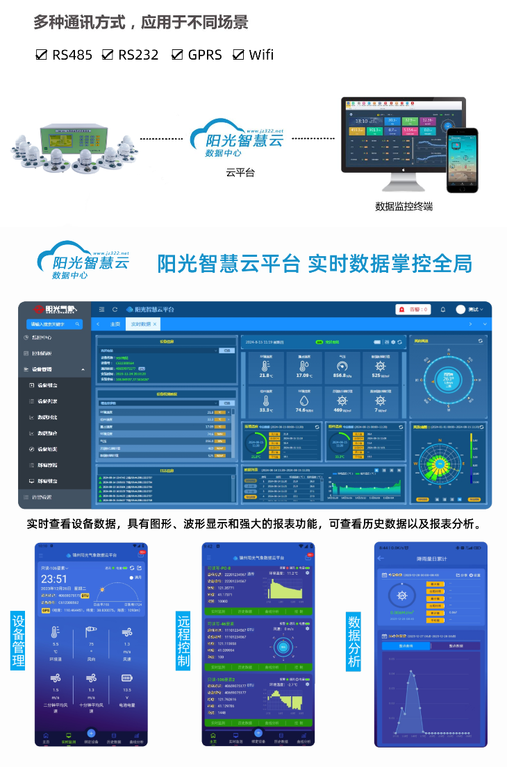12. 數據可上傳我司智慧云平臺,支持 PC、手機 APP、小程序等多端軟件對設備進行管理,可視化數據大屏視圖,動態顯示數據、包含設備在地圖上的分布、告警日志、統計數據等。