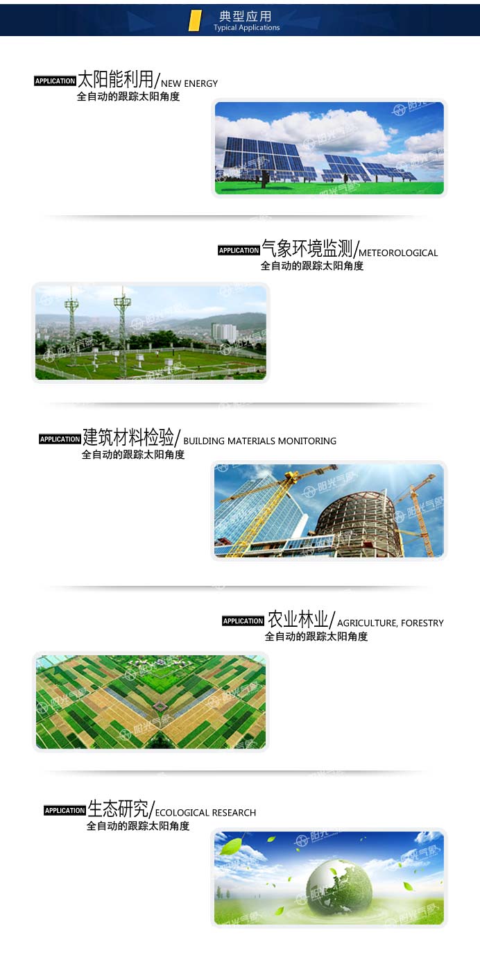 TBS-YG5全自動跟蹤太陽輻射儀是目前較先進的無人值守型太陽輻射儀器,解決了國內太陽輻射儀器需人工維護的弊病(特別是直接輻射與散射輻射),滿足了全自動化測量的要求,它是將機器人控制技術與輻射儀器完美結合的產品, 系統采用光追蹤+旋轉角度測量+光照強度測量+跟蹤運行等綜合技術, 可保證高精度的跟蹤太陽。